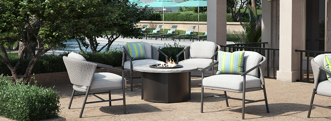 A comprehensive collection of aluminum, resin, and woven furniture, including seating, tables, umbrellas, and accessories.